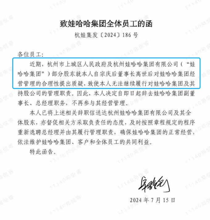 宗馥莉亲笔签名的《致娃哈哈整体职工的函》
